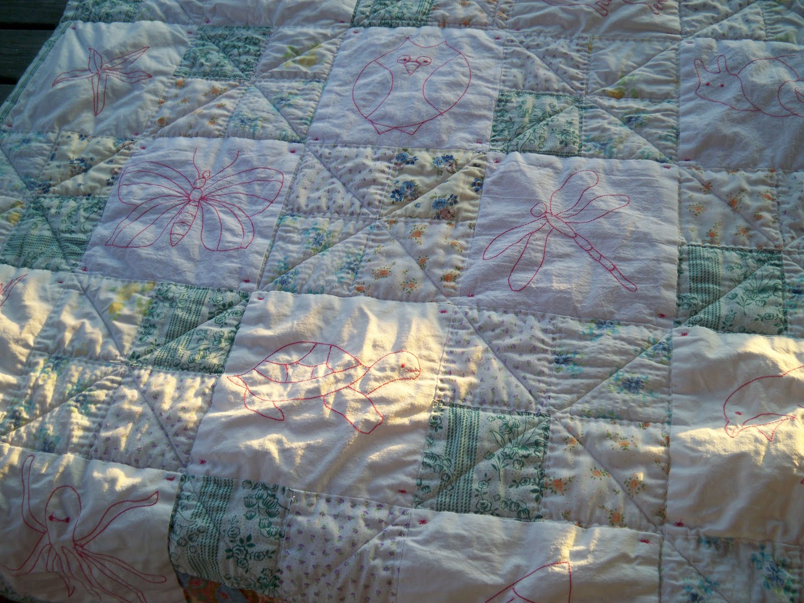 In April, one of DD2's best friends got a baby sister, and we had to find her a gift. Baby blankets that can be thrown in the washer is always useful, so DD2 helped tracing the motifs onto white cotton, I sewed them with triple stitch (it's all machineembriodery!), and then we picked the fabrics for the squares. It all came from my stash, and most of it is actually second hand. Polyester batting, and cotton backing. Machinequilted first,..but that looked too simple, so I handstitched around the squares. I've probably broken every quiltingrule there is, but it was fun!